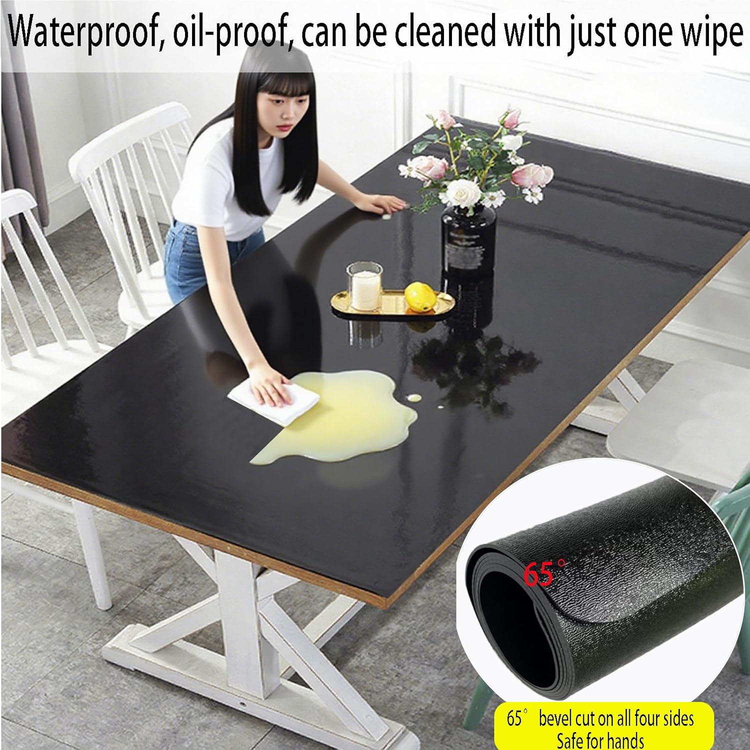 Product descriptionColor:Pure black, opaque Material: Pvc Packing: RollRecommended Wash Type: Wipes clean with a damp clothThe Pvc table protector cover is suitable for Wooden Furniture,party/metal/card table protector,carnival table protector cover mat,chair floor pad is enabled to display your coffee,picnic,Night stand conference,dining room table,shelves,cooktop painting tabletop dressing cabinet,camping outside/fitted massage/breakfast/dining room/living room table/Tv bench top,bedside/yard/office desk,cocktail/bar table surface top screen protectionThe Multi Size black Not Transparent Table Cover Protector Protect your table or tablecloth against scratches scuffs stains,Heat Resistant anti-scratch;Warm tipsPlease measure your furniture siezs (Length x Wide) firstly,then choose the right size or order a bigger one to cut to fit.The cover will be slightly bigger than advertised size for marginof shrinking, therefore slight size difference is not qualified asa quality issue.. 0.2~0.3 inch extra tolerance isin built in the dimension formarginof shrinking.How to lay it flat on the table when unroll it?1.Heat it with a hair drier and put something heavy on the curled places.2.Lay it unroll under the sunlight minutes;or stick double-sided tape dots3.Lay out in Reverse-Roll direction, use heavy duty items pressing in days.4.Soak it in hot water for a few minutes, then take it out and dry it with a dry cloth. Spread it flat and let it dry.;