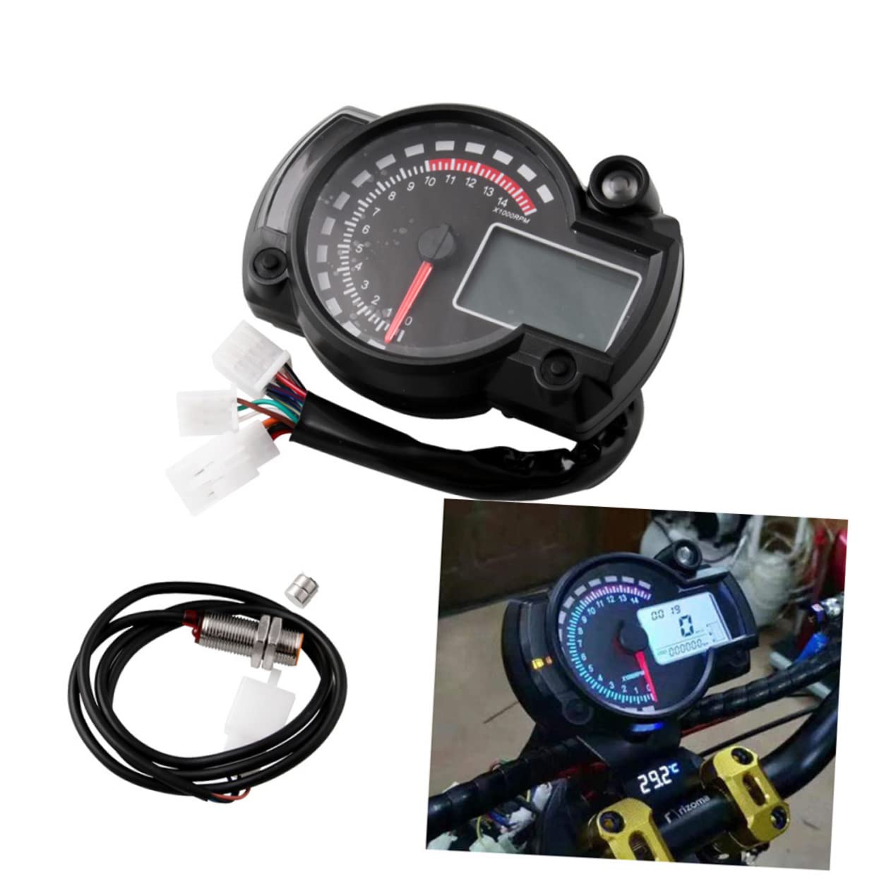 Package List 1 x motorcycle speedometer Characteristics - Function display: Turn signal light, headlight, oil light and water temperature alarm motorcycle odometer. - Material: ABS digital motorcycle speedometer. - Size: 15x11x8cm motorcycle speedometer mph - ColorBlack bike speedometer odometer - With engine failure and battery under-voltage indicator light, a great add-on decoration for your motorcycle universal motorcycle speedometer. - Tachometer, speedometer and gear indicator, a high performance kit for motorcycle digital speedometer for motorcycle. - 7-color backlight display, easily viewing at all angles during lighting conditions or in motorcycle speedometer tachometer. - Made of material for lasting use motorcycle lcd speedometer.Goods Descriptionspeedometer for motorcycle Are you looking professional, yet motorcycle speedometer? Are you in search of a sturdy, trustworthy tool that can do multiple jobs at once? , ! Our professional motorcycle speedometer must meet you needs.motorcycle digital speedometer one of the choices for you