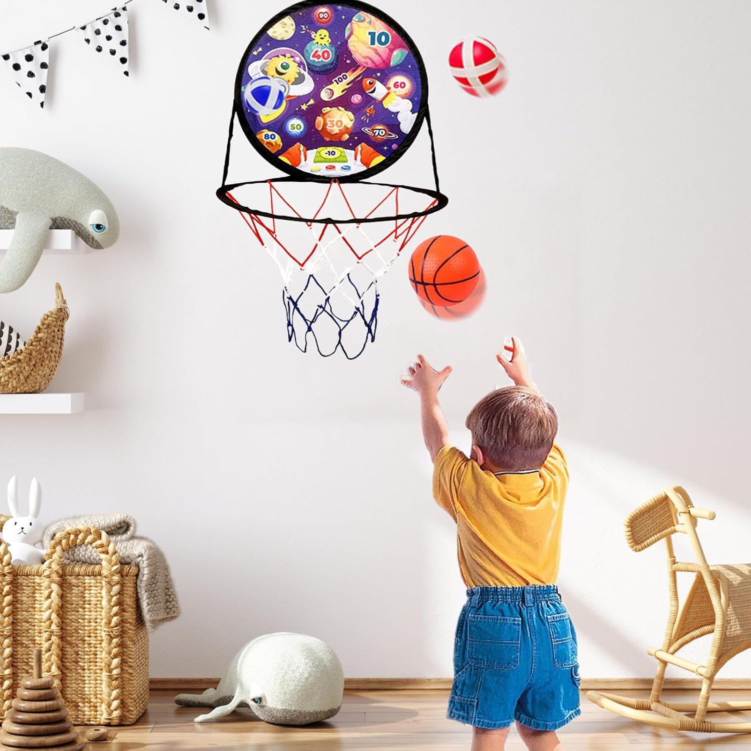 Designed with safety in mind, the 2-in-1 Basketball Hoop 2-in-1 Hours of sports-driven sports play; Whether worn indoors or outdoors, makes a thoughtful birthday gift or a party favor for boys and girls, with interbacks that ensure entertaining yet safe play experiences without darts Specification Product name: basketball stand and dart board Product size: about 36.5x64cm/14.37x25.2inch Material: ABS + PP + PU Weight: 290g List 1 x dart board. 1 x air pump. 1 x Basketball. 1 x hook. 8 x Balls Note: Due to different lighting and screen settings, the colour of the item may be slightly different from the picture. Due to different manual measurements, please allow 1-2 cm size difference.