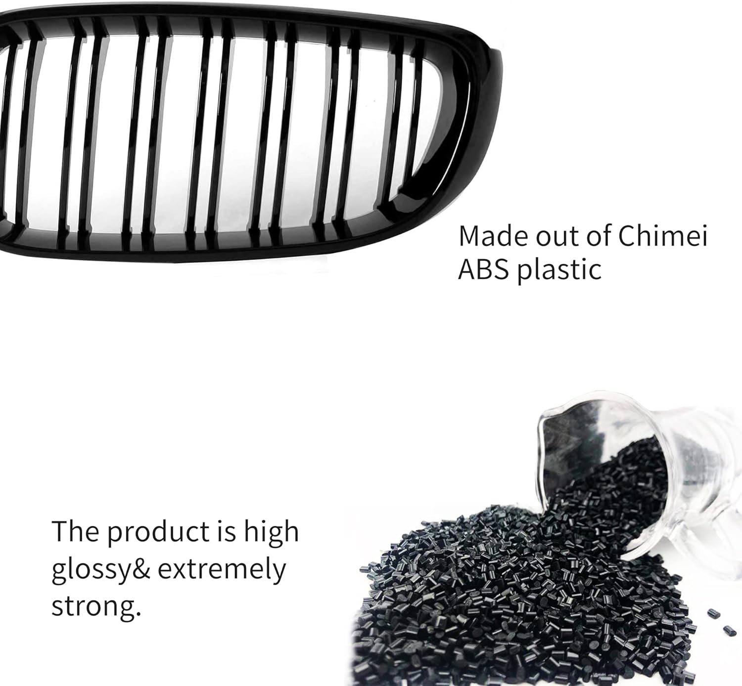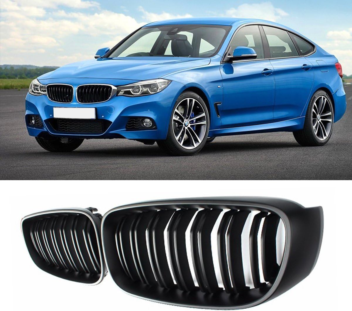 Will fit for following BMW vehicles:3 series GT/F34[5-door fastback]Specifications:The grille replaces your stock OEM chrome part and brings a sportier look to the front bumper.It is made out of strong and enduring ABS material and finished w/ high gloss paint.The paint is processed under high temperature circumstances, thus is enduring & UV-cut.Quick installation, no modification required (professional installation is yet strongly recommended).Package includes:1 pair of replacement grille (left & right)No installation manual