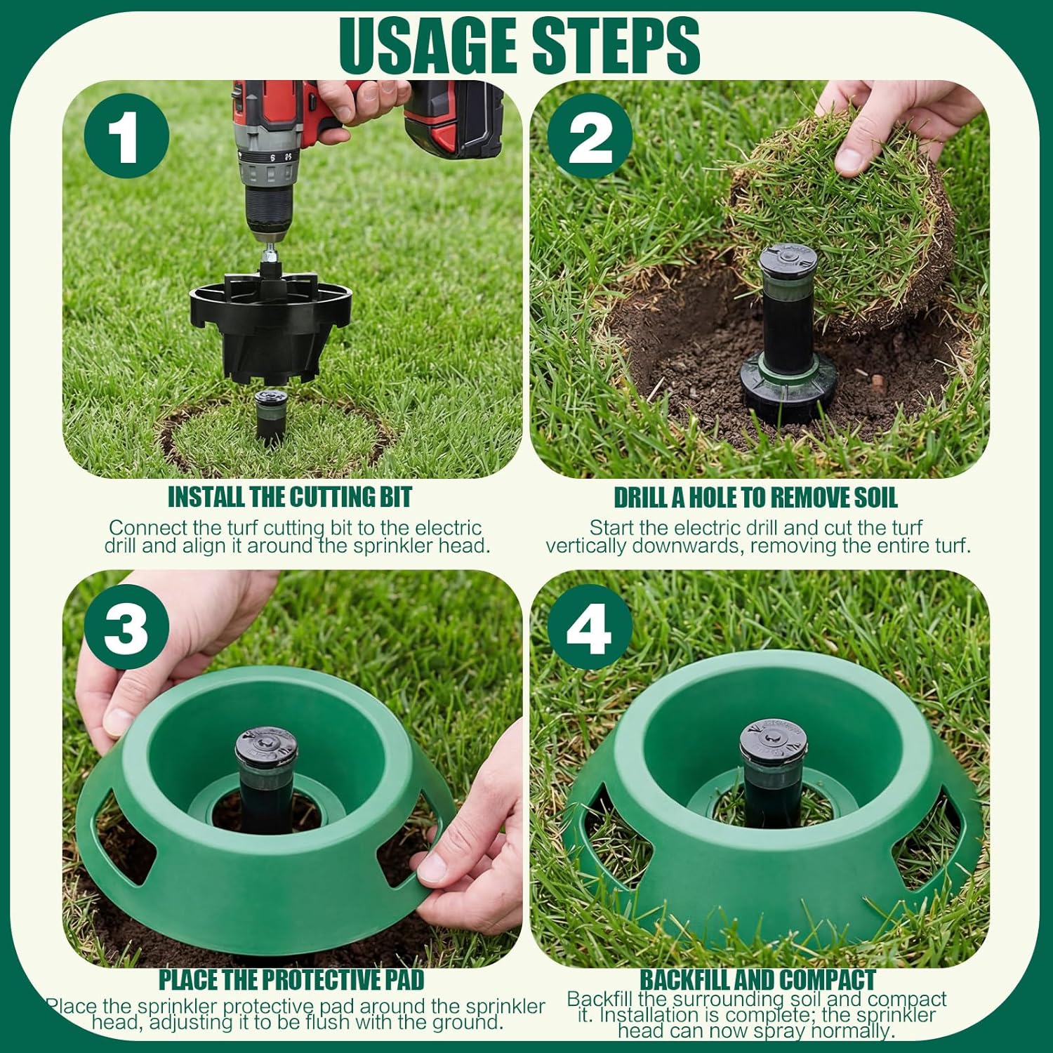 Features: This value set includes ten sprinkler protectors for lawn, allowing you to outfit multiple sprinkler heads across your yard at once. The ample quantity ensures consistent protection and a uniform appearance for your entire irrigation system, making it an efficient solution for maintaining optimal spray coverage everywhere. Crafted in a low-profile dark green hue, this sprinkler donut blends discreetly into your lawn when installed. It functions effectively as a sprinkler protector to block overgrowth without creating an eyesore, helping you preserve a neat, clean-looking landscape with minimal visual intrusion. Specifications: Material: plastic Color: dark green Size: Diameter: 8 inch Height: 2.25 inch Center opening: 2.5-inch Package includes: 10 Sprinkler protector donuts with 1 sod cutter drill attachment Notes: Manual measurement, please allow slight errors on size. The color may exist a slight difference due to different screen displays