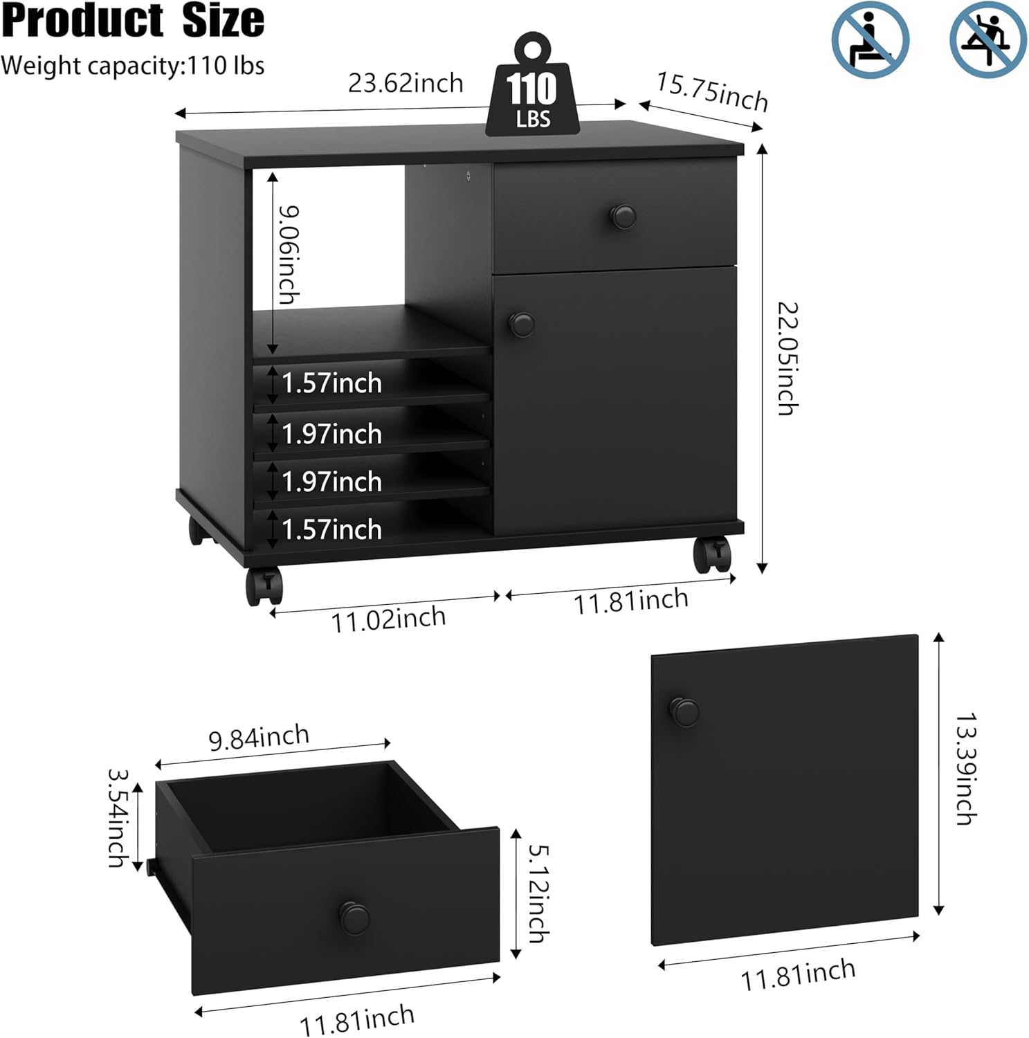 | Additional Features | Wheeled, Adjustable Shelf, Drawer, Doors |