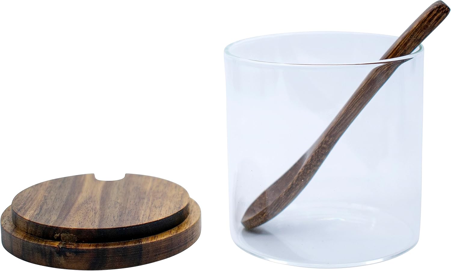 Simplify your culinary experience and keep your kitchen tidy with our versatile condiment jar set!Add a touch of elegance to your kitchen with this sleek and practical Set of 3 Glass Condiment Spice Jars. Each jar features a generous 10 fl oz capacity, making them perfect for storing a variety of condiments and spices such as sugar, chili flakes, cornstarch, salt and much more!Each jar measures 3" in diameter and 3.25" in height, designed to take up minimal space on your counter or inside your cabinet, while still offering ample storage. The crystal clear glass design allows you to easily identify the contents and gauge refill times.The set also includes corresponding bamboo lids and spoons, adding a touch of natural elegance to the ensemble. Each spoon measures 4.9" in length, allowing for easy scooping and dispensing.Moreover, the set is complemented with a functional bamboo tray. With dimensions of 11" in length and 4" in width, the tray conveniently houses all three jars for easy transport and organization. Additionally, it can be utilized to serve finger foods or drinks, adding to its versatility.The entire set weighs 1 lb 6 oz, ensuring sturdiness without being overly heavy. This makes it an ideal gift for housewarming parties, weddings, or simply for those who appreciate stylish kitchenware.Specifications:Tray Dimensions: L 11" x W 4"Jar Dimensions: D 3" x H 3.25"Spoon Length: 4.9"Set Weight: 1 lbs 6 ozMaterial: Glass (jars), Bamboo (lids, spoons, tray)